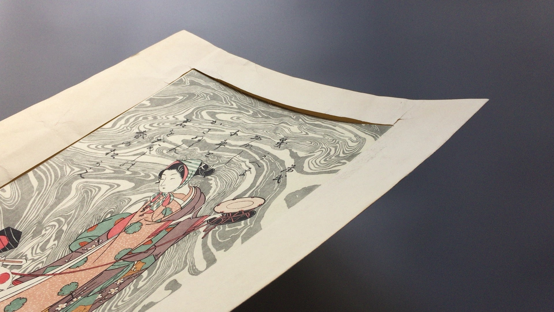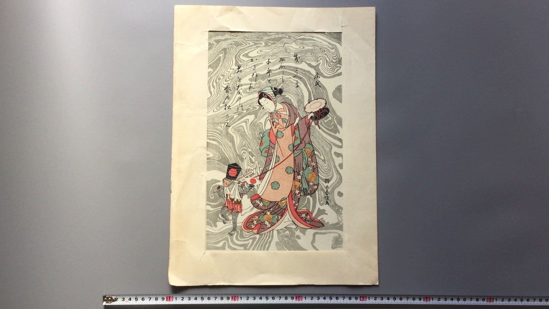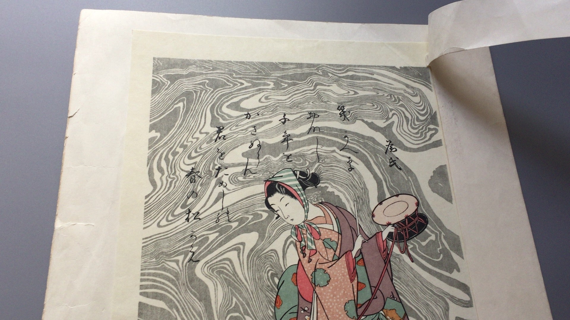 Suzuki Harunobu's "Early Spring Woman Monkey Turning". This is Suzuki's characteristic work, in which patterns are added to the background using suminagashi techniques.